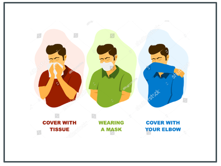 - If no available tissues, cough or sneeze into the upper sleeve, not hands